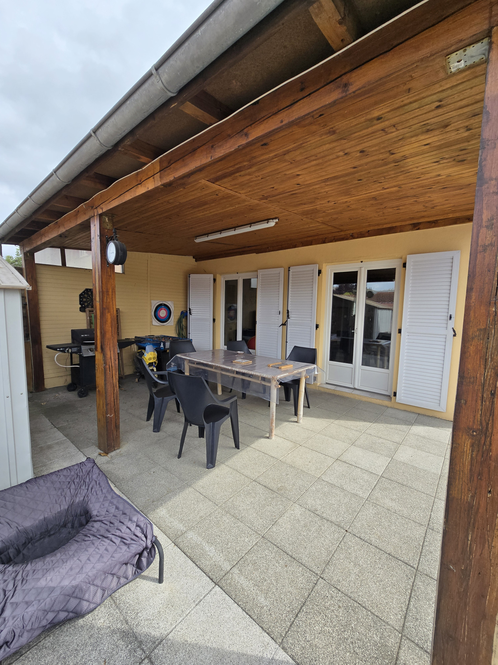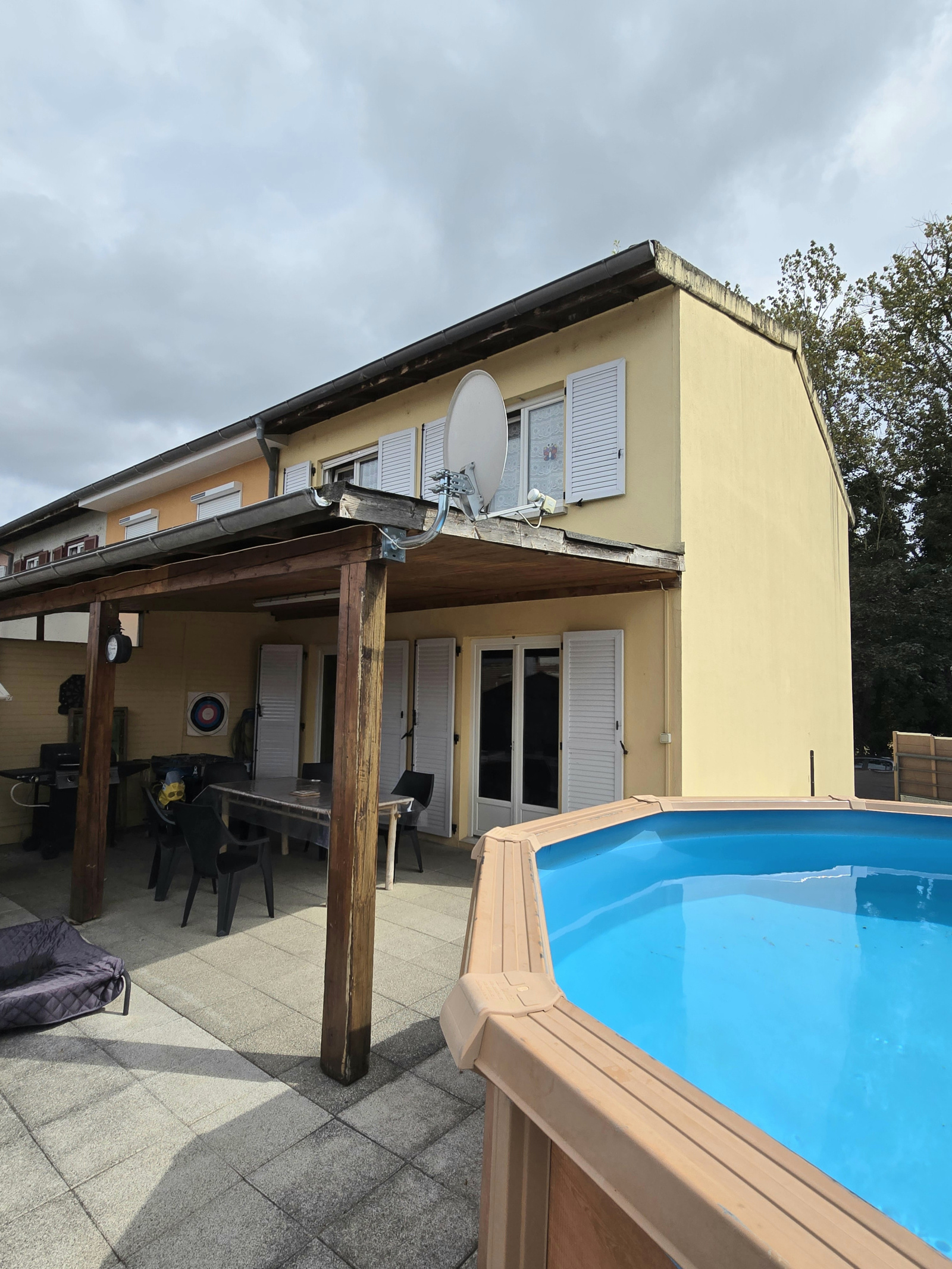 - Belle terrasse de 55 m² comprenant une pergola de 20m², une piscine hors-sol ronde, un cabanon, un espace détente.