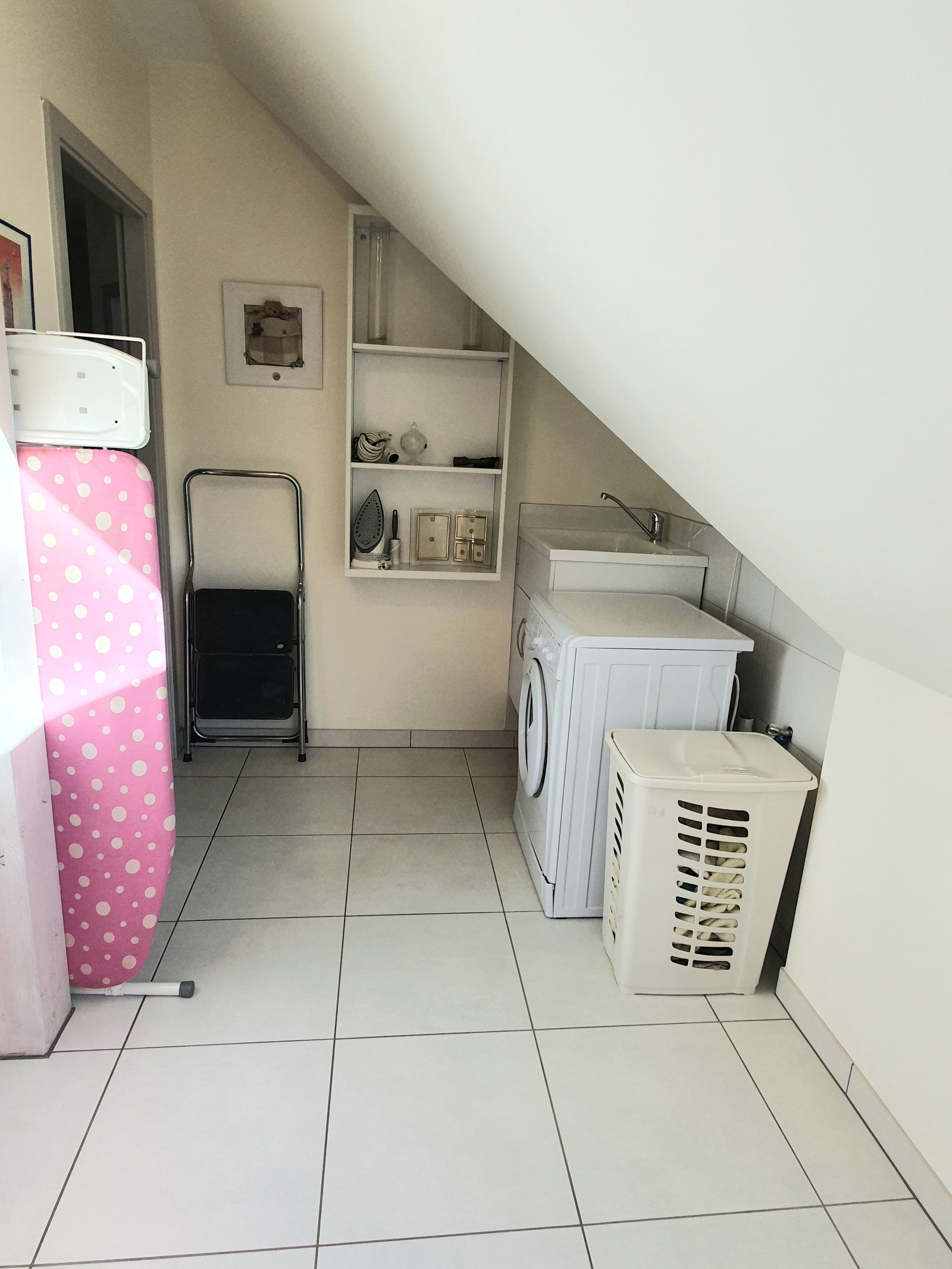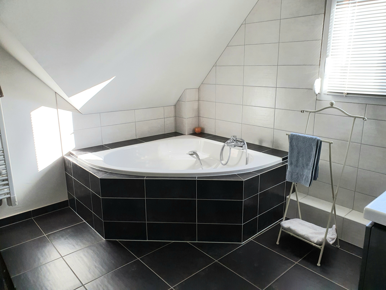 A l’étage, deux chambres, dont une grande chambre parentale, un dressing, un bureau (possibilité de création d’une troisième chambre), une salle de bain spacieuse avec baignoire d’angle, un WC séparé, une buanderie.