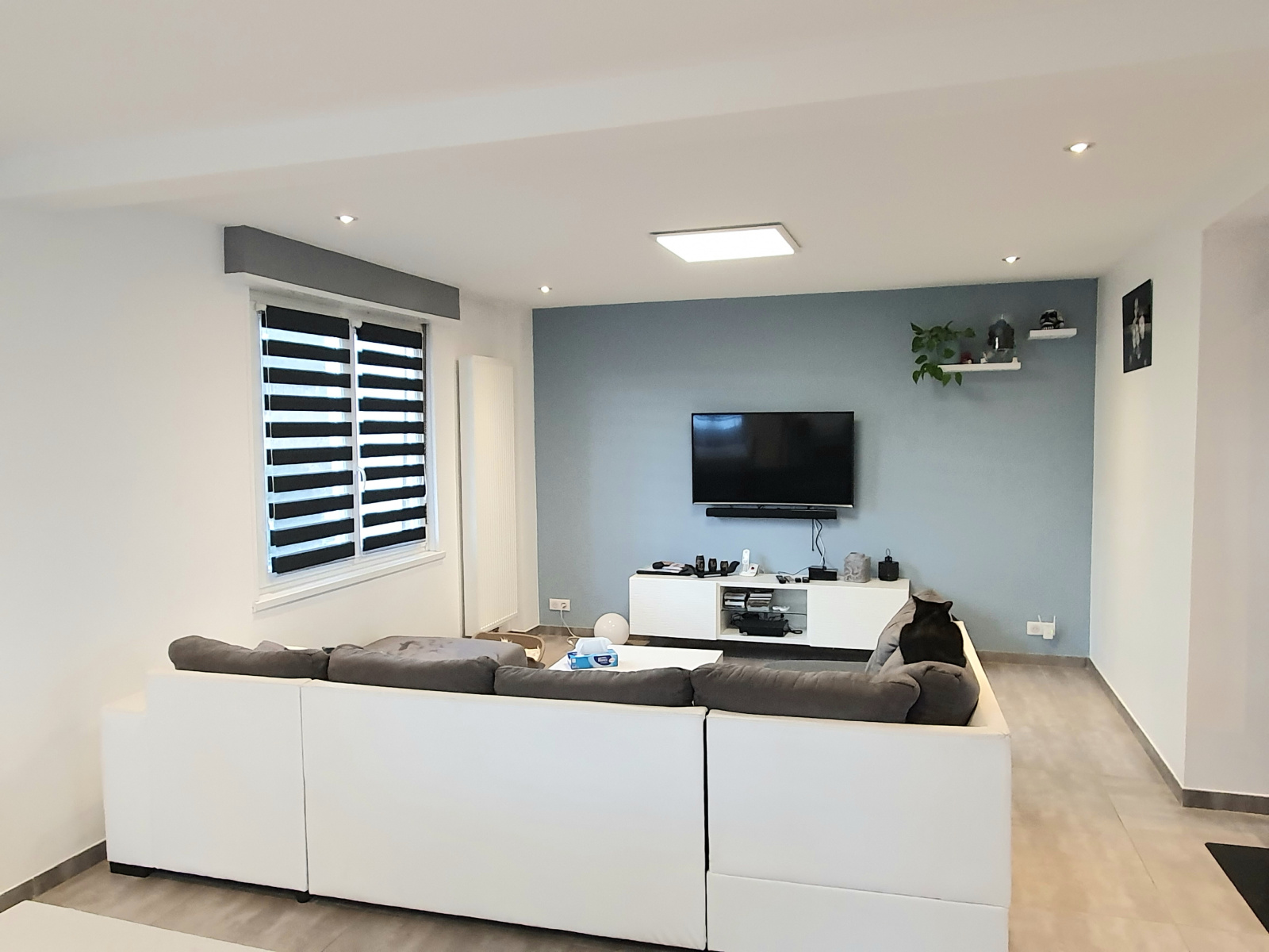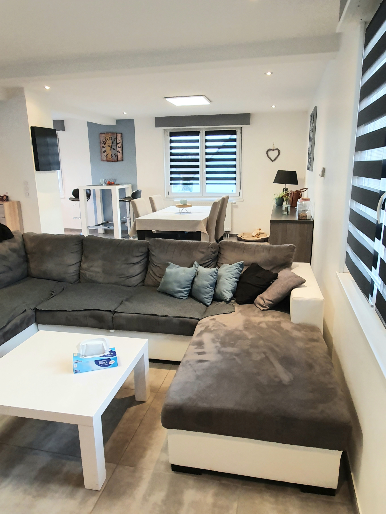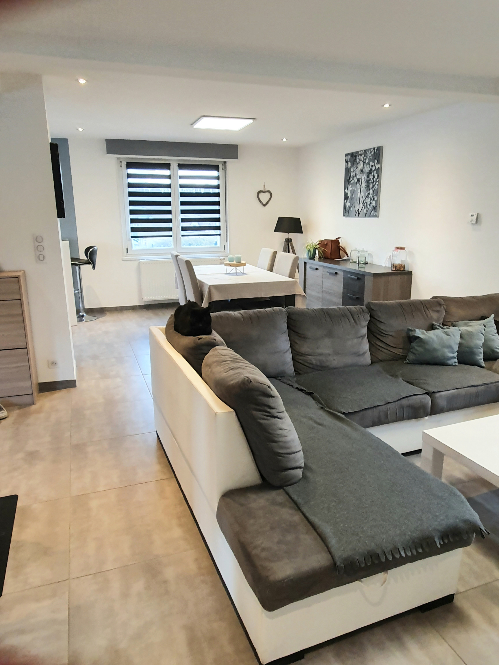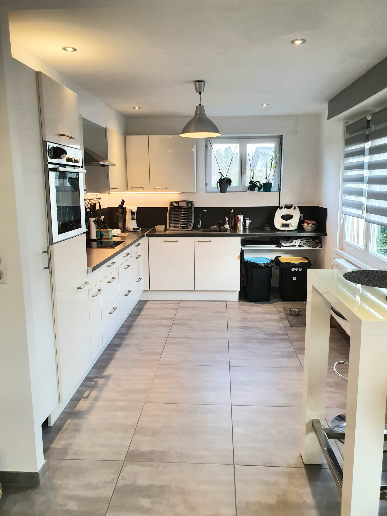 Au Rez-de-chaussée, l'espace de vie moderne, lumineux et décoré avec goût propose une très belle cuisine contemporaine de 12m² ouverte sur un salon/séjour de d’env. 40 m². Un poêle à bois contribue à l'atmosphère cocooning.